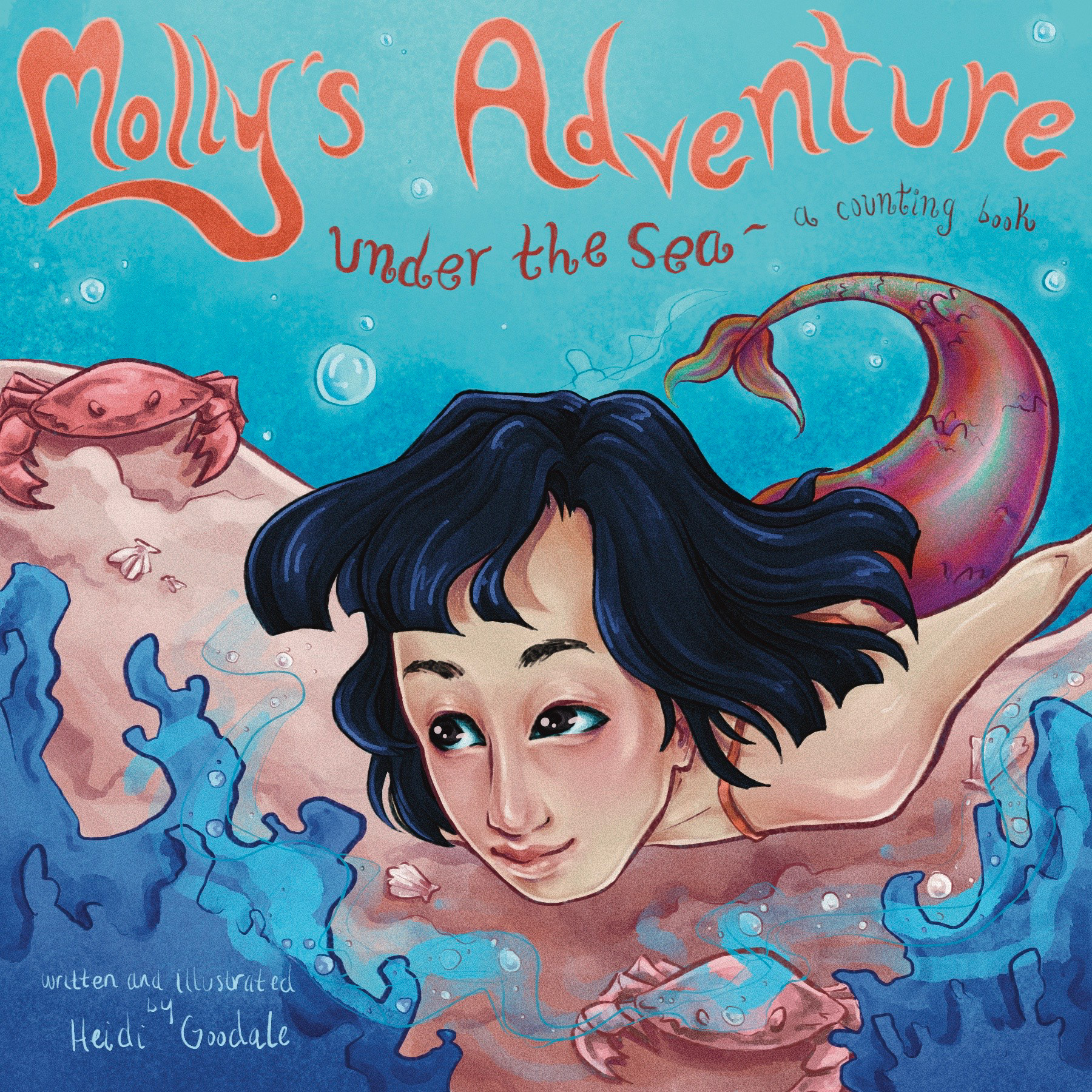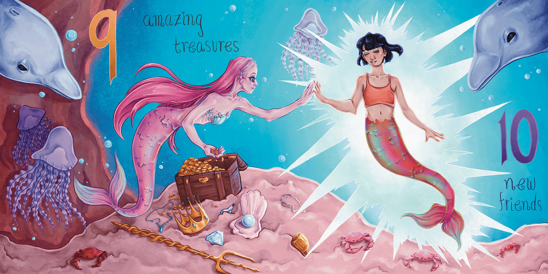 Illustrated children's counting book based on a girl's adventures under the sea. Digital illustrations done in Procreate. 2022.