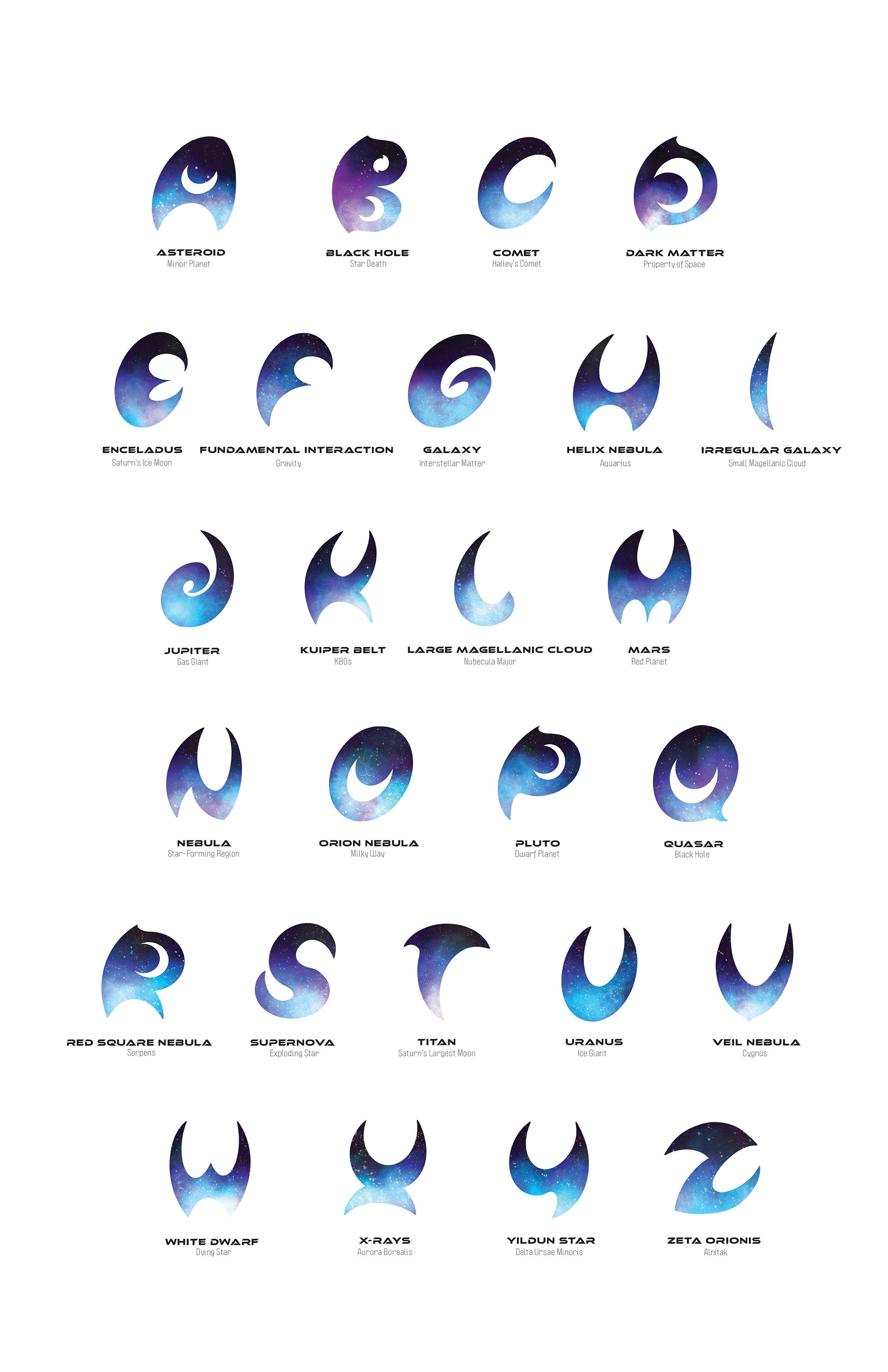 Hand-rendered abecedary poster designed with a space theme. Letters digitally created in Procreate and Adobe Illustrator. 2022.