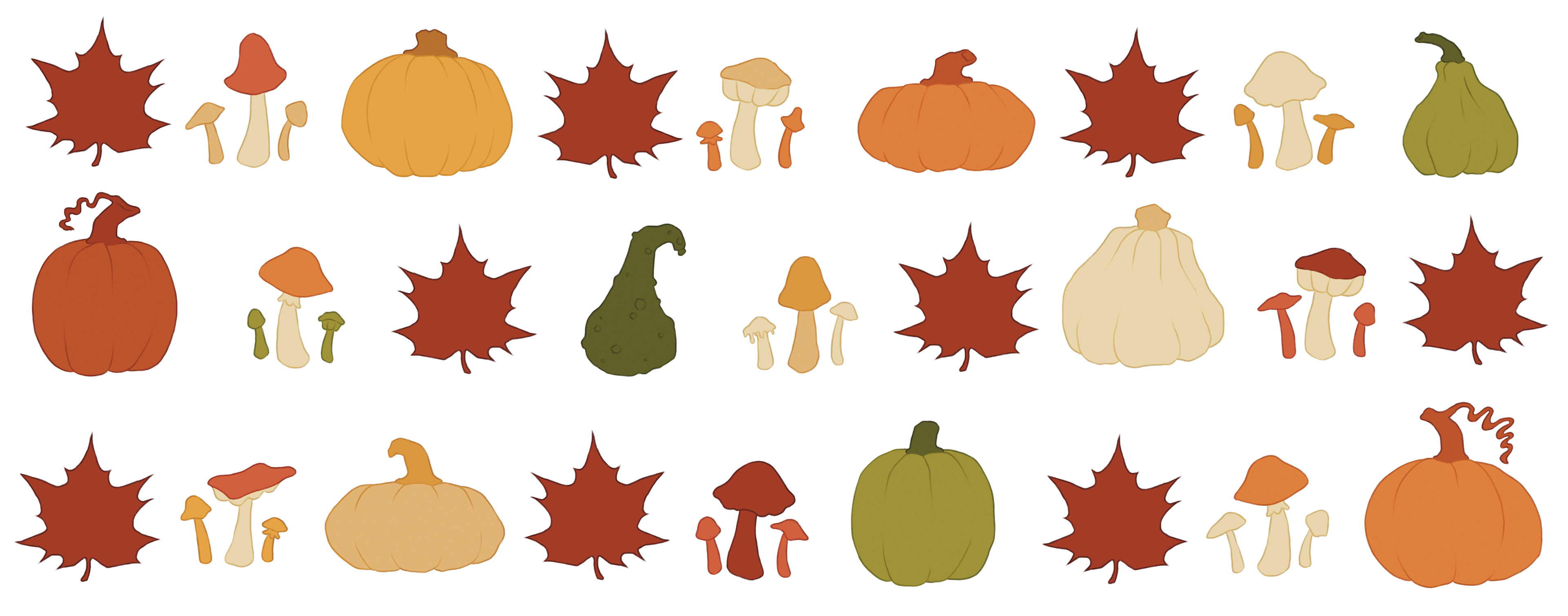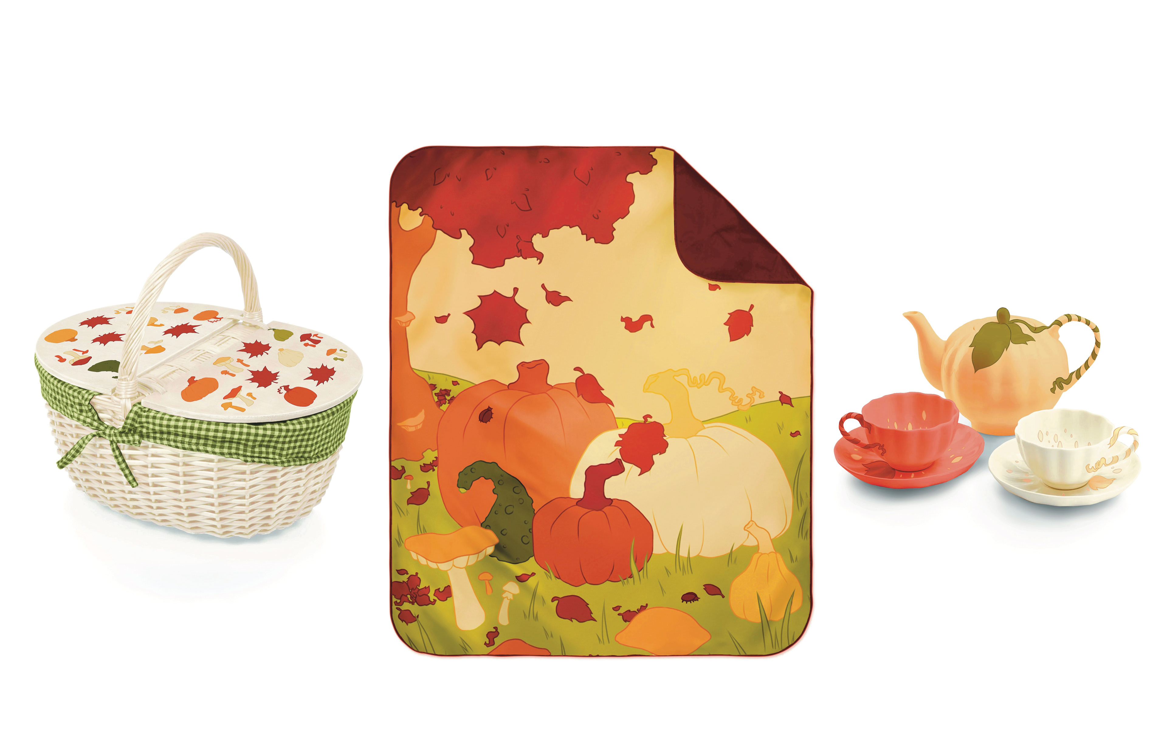 A fall themed picnic set, featuring a picnic basket with an illustrated pattern, an illustrated picnic blanket design, and an illustrated tea set design. Digital illustrations done in Procreate. 2024.
